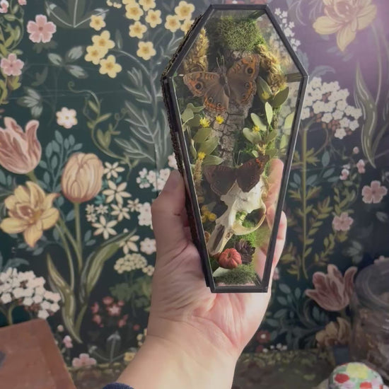 This thoughtfully curated glass coffin display celebrates the natural world in all its forms. A muskrat skull rests on a soft moss bed, accompanied by delicate buckeye butterflies and lovely dried flowers—creating a meaningful tribute to wildlife and nature's cycles.