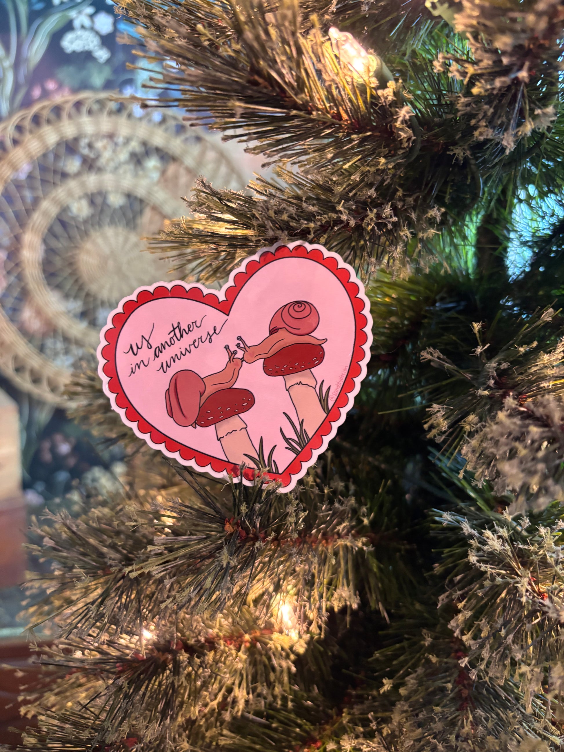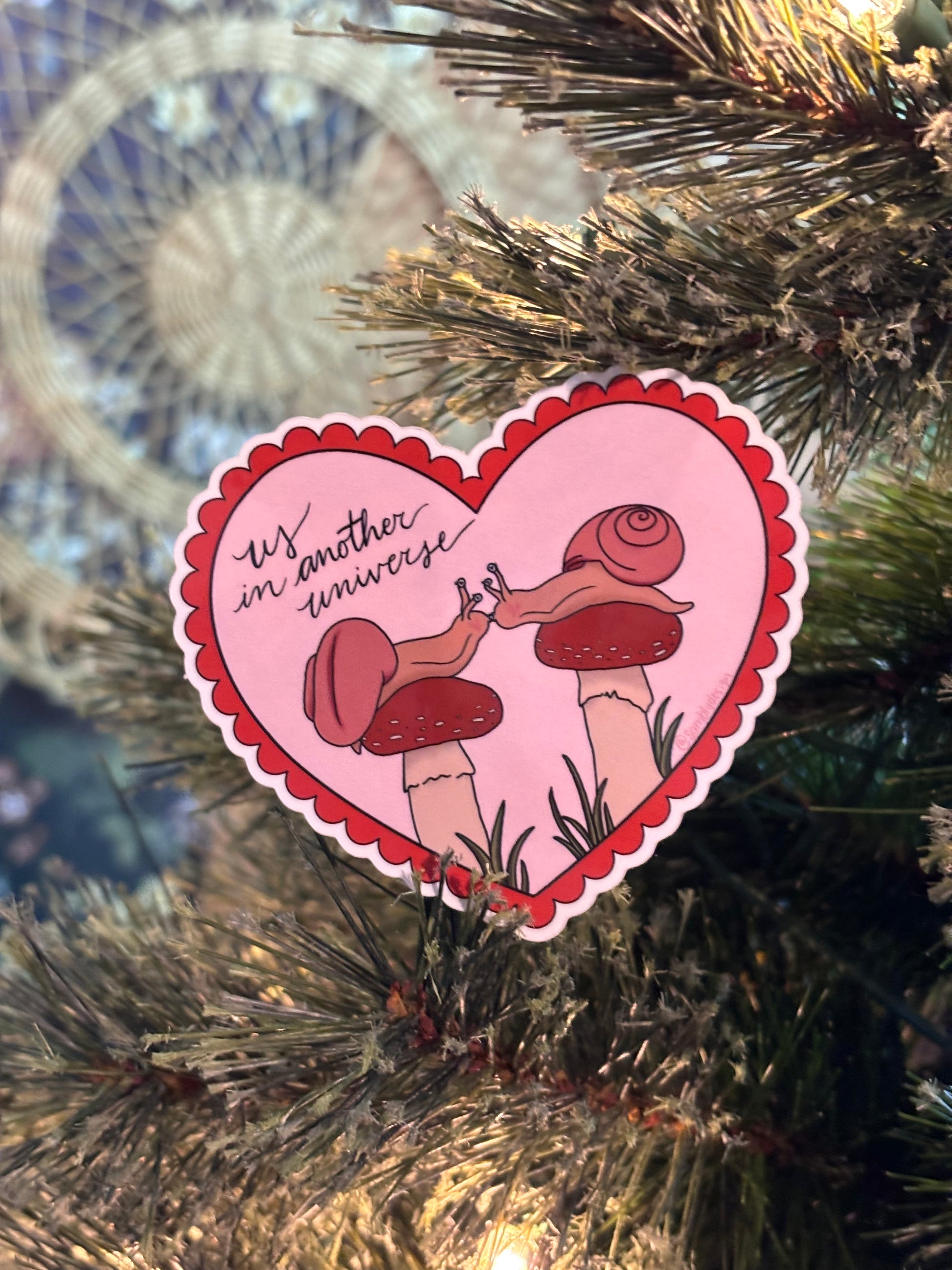 My hand-drawn design featuring two snails on neighboring mushrooms kissing, accompanied by the words: "us in another universe". A silly love note for your sweetest love.